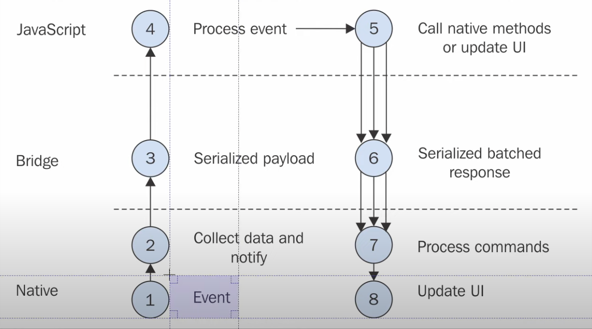 (1) 이벤트가 생기면 이던 native(ios, 안드로이드)에 기록이 되고, (2) 이런 기록을 수집하여 화면을 통제한다. 이로 인해 사용자가 화면을 누르는지(이벤트) 아닌지 확인 할 수 있다. (3)이벤트가 발생하면 bridge를 통해 javascript에 전달한다. (4)코드를 실행시키면 (5)화면이 바뀌고 (6) 응답을 받아 (7)리액트 네이티브는 네이티브 운영체제에 메세지를 보내 (8)UI를 업데이트 한다.