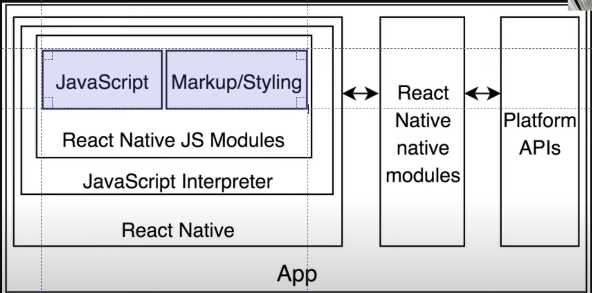 리액트 네이티브 같은 경우는 이런 구조로 되어 있는데 JavaScript, Markup/Styling은 코드를 작성하는 것, 그리고 나머지 부분 같은 경우가 앱을 만들 때 필요한 부분이다. 이 부분은 안드로이드냐 ios이냐에 따라 설치해야 하는 것들이 있지만 지금은 아직 배우는 과정이고, 완선된 프레임만 봐도 충분한 상황이기 때문에 컴파일하지 않고 expo라는 어플리케이션을 설치하면 됨!!