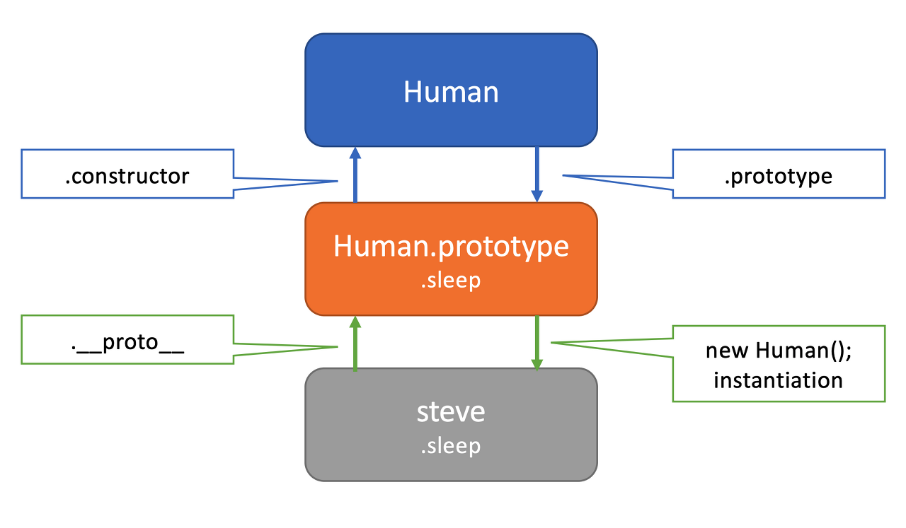 steve ➡️ Human.__prototype__ ➡️ Human ➡️ Object.__prototype__ ➡️ Object ➡️ (null)