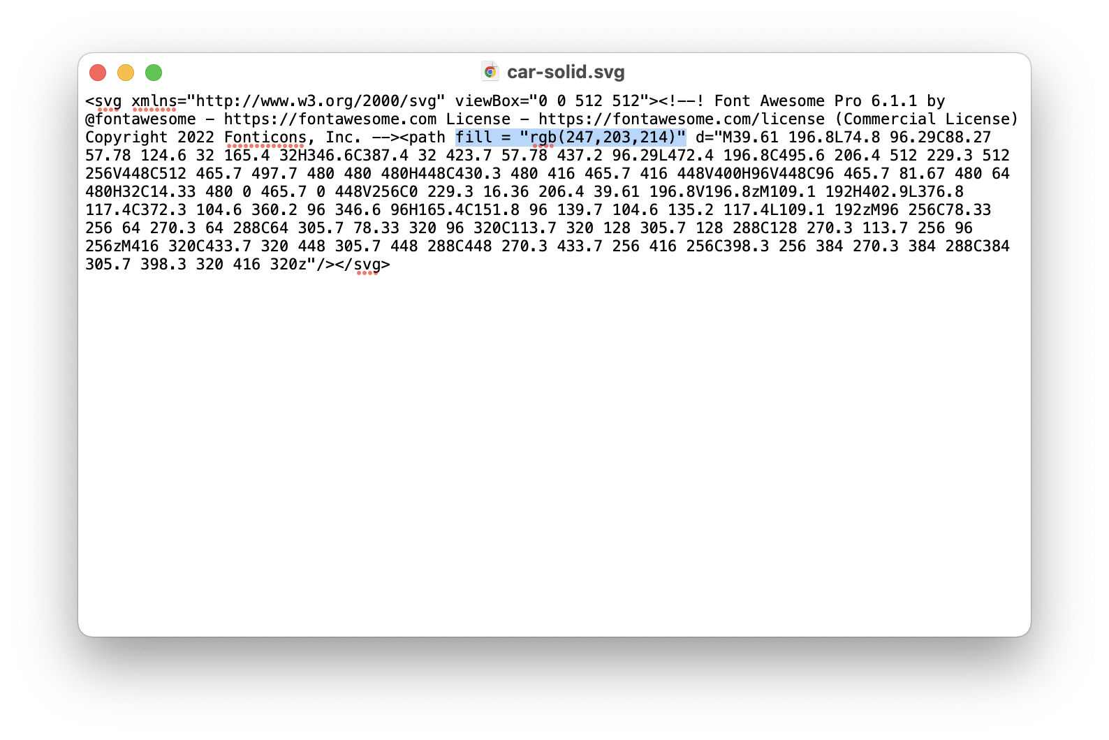 4. 다운로드 된 파일을 텍스트 편집기로 열어 path 옆에 fill = "색깔이름"을 바꿔준다. 만약 없다면 입력해주면 된다.